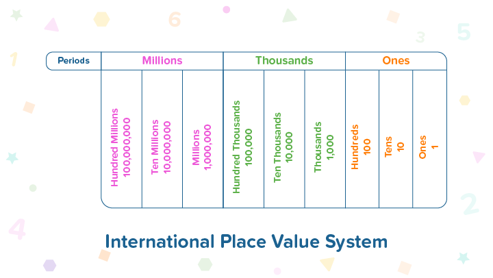 1 million = 1,000,000 - The fourth period in the international place value chart is billions.